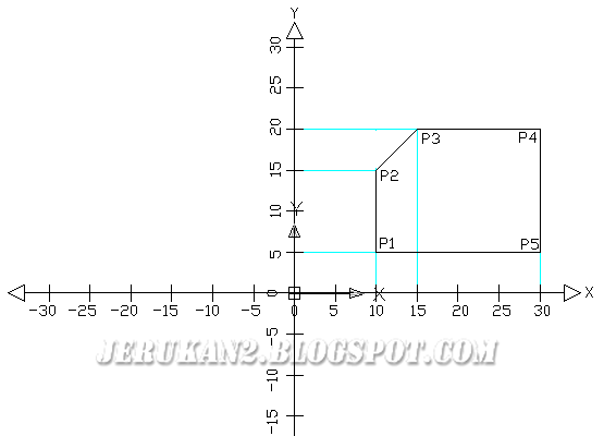 Format memasukan koordinat menggunakan keyboard adalah seperti di bawah:- Absolute Cartesian: Semua titik koordinat bermula dari titik point UCS. Ini bermakna titik x=0,y=0 yang sama digunakan. Contoh cara memasukan koordinat Absolute, taip #10,5 dimana '#' mewakili absolute '10' ialah nilai x dan '5' nilai y